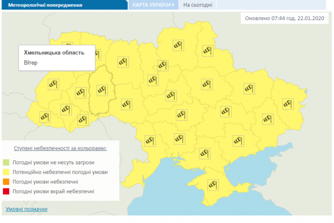 22 січня в усіх регіонах України очікується сильний вітер, оголошено штормове попередження. Про це повідомляють в Українському гідрометцентрі. Пориви вітру впродовж дня сягатимуть 20 м/с.