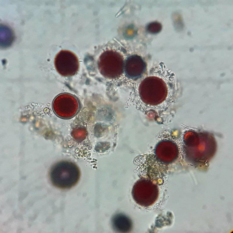 Оскільки, крім зеленого пігменту – хлорофілу, їхні клітини містять ще й червоний каротиновий шар, на снігу виникають червоні плями ніби від малинового джему.