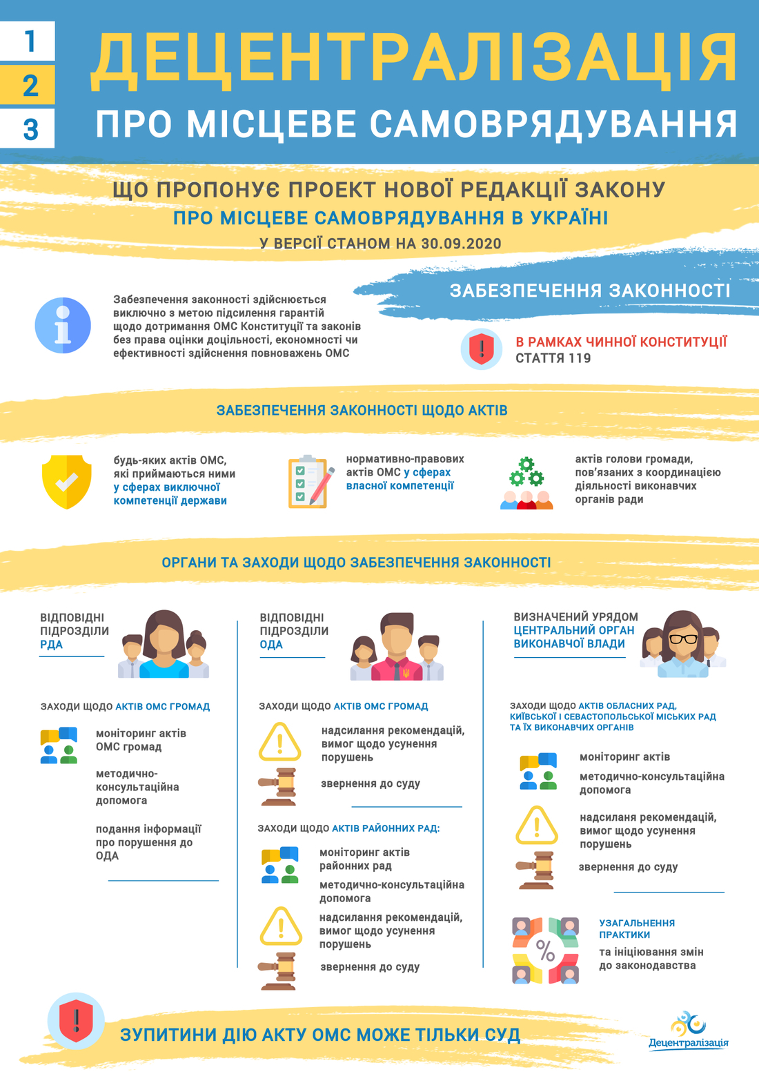 Проект закону “Про місцеве самоврядування в Україні” розглядтиме робоча група з питань впровадження реформи децентралізації влади в Україні. “Децентралізація” спільно з Мінрегіоном підготувала три короткі інфографіки, щоб нагадати, що передбачає законопроект. Перша з них – про основні зміни, запропоновані проектом закону. У другій говоримо про забезпечення законності.