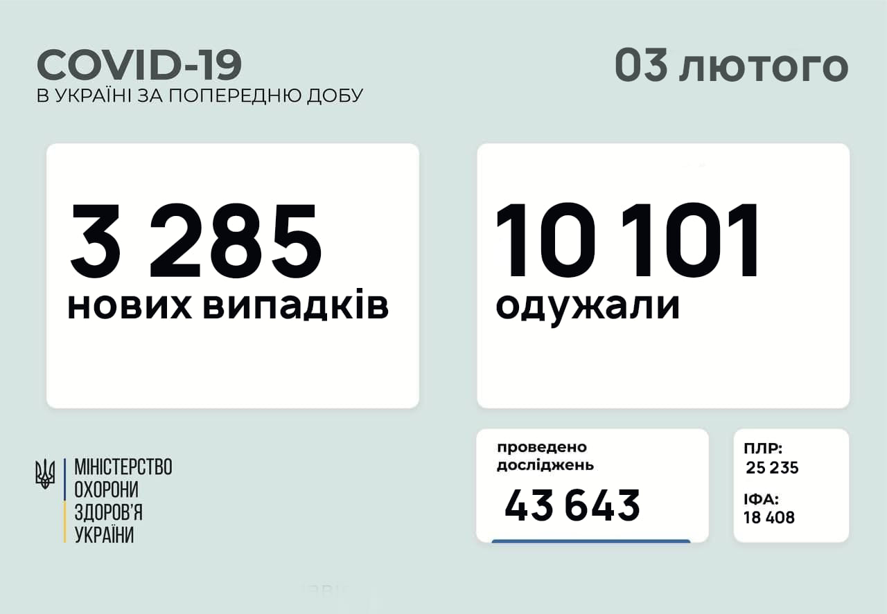 3285 нових випадків коронавірусної хвороби COVID-19 зафіксували в Україні станом на 3 лютого 2021 року. Зокрема, захворіли 156 дітей та 186 медпрацівників.