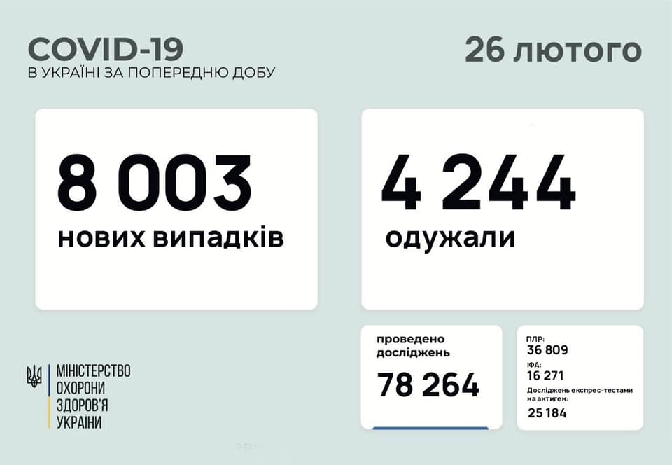 8 003 нових випадків коронавірусної хвороби COVID-19 зафіксували в Україні станом на 26 лютого 2021 року. Зокрема, захворіли 475 дітей та 312 медпрацівників.