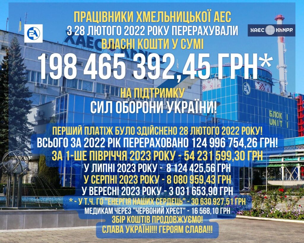 Працівники Хмельницької АЕС від перших днів повномасштабного вторгнення рашистів в Україну підтримують Збройні Сили, направляючи частину власних коштів на спецрахунок НБУ та на рахунок ГО “Енергія наших сердець”, яка, у співпраці з робочою волонтерською групою, забезпечує придбання та передачу необхідного для Сил Оборони України обладнання. Завдяки зусиллям усіх працівників ХАЕС понад 198 млн грн мільйонів гривень вже перераховано на потреби захисників!